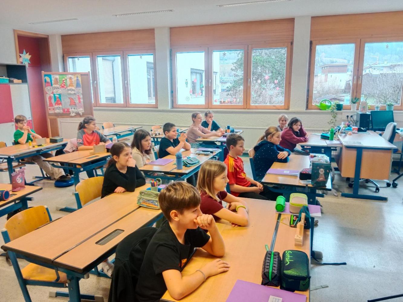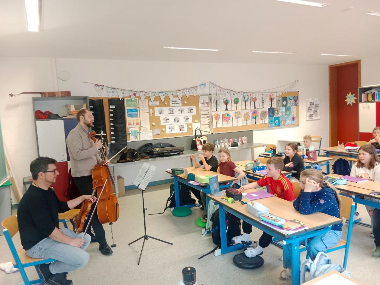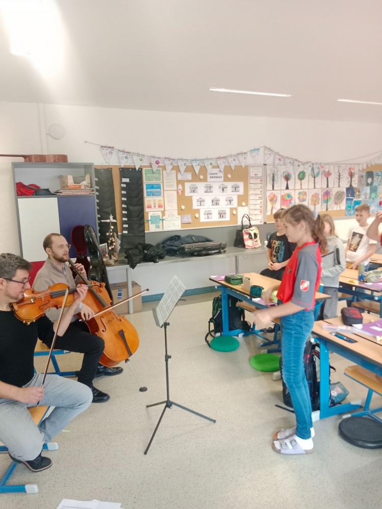 Ende Dezember und Anfang Jänner besuchten jeweils zwei Musiker:innen des TSOI den Musikunterricht der 1. Klassen. Bei diesem tollen Workshop wurden den Schülerinnen und Schülern die Instrumente Violine, Violoncello und Querflöte vorgestellt. Auch das Vorspielen in Form eines kleines Konzertes kam nicht zu kurz. Höhepunkt war für die Schülerinnen und Schüler sicher, als sie zum Abschluss die Musiker:innen dirigieren durften.